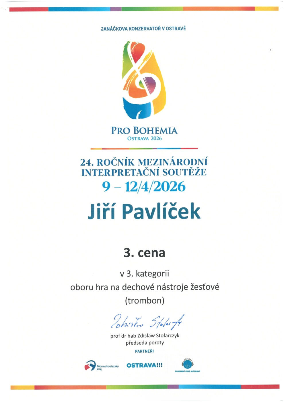 Na 24. ročníku Mezinárodní interpretační soutěže Pro Bohemia Ostrava 2026, která se uskutečnila ve dnech 9.–12. 4. 2026 v Ostravě,