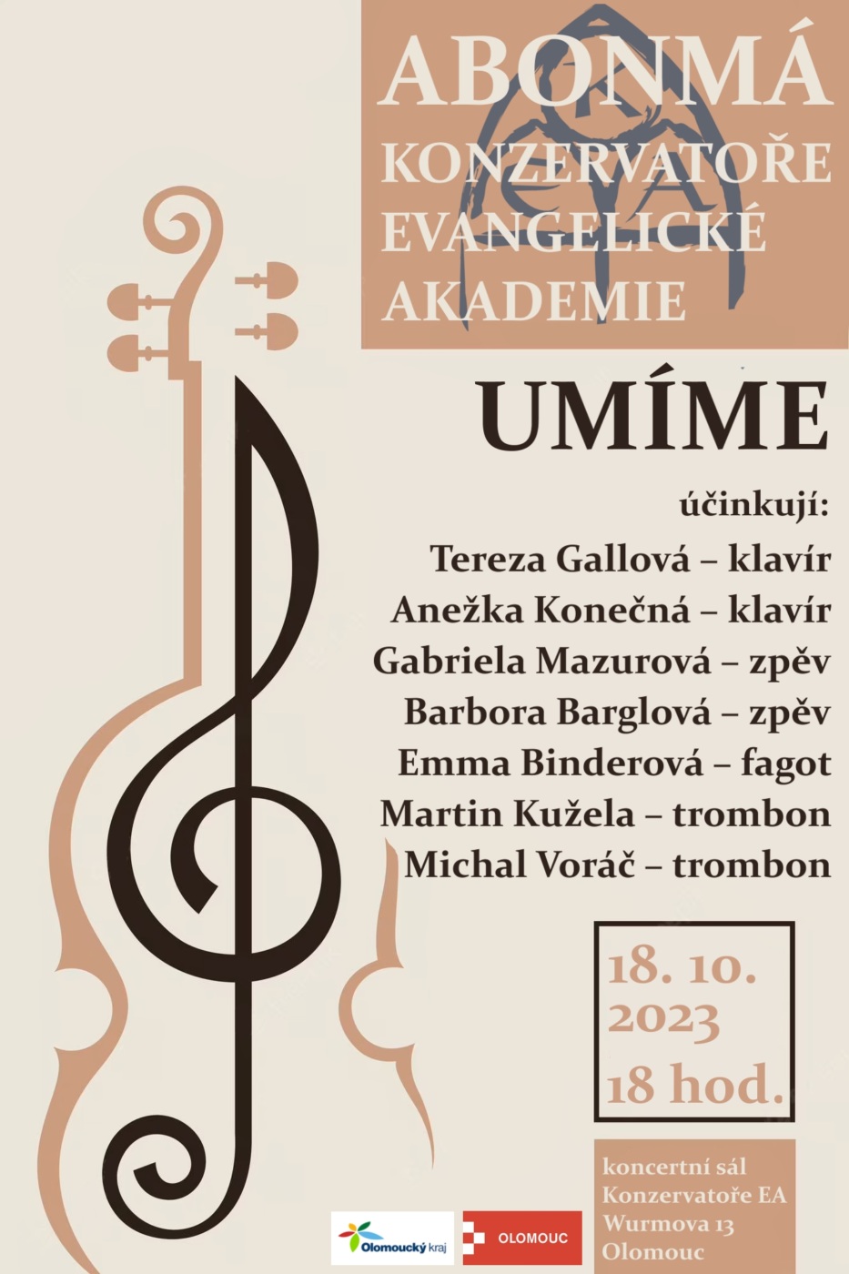 Abonmá A1 – UMÍME 18 | 10 | 2023 18:00 hod.Koncertní sál Konzervatoře EA, Wurmova 13, OlomoucKoncert studentů oceněných na celostátních a mezinárodních soutěžích.