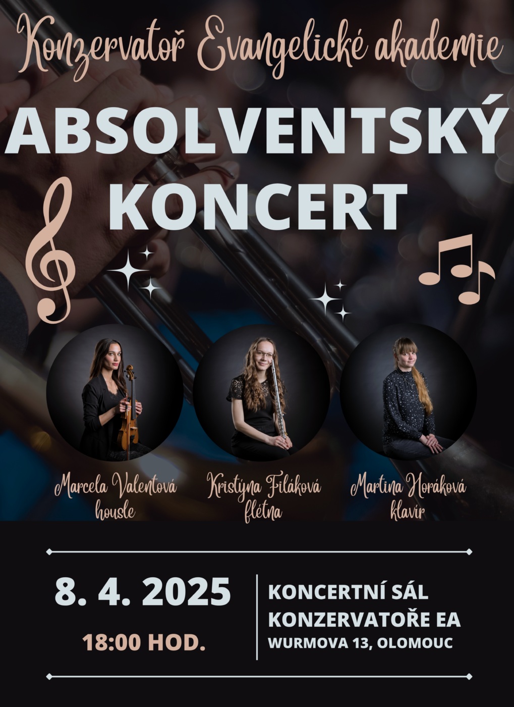 Absolventský koncert: Marcela Valentová – housle, Kristýna Filáková – flétna, Martina Horáková – klavír 8 | 4 | 2025 18:00 hod.Koncertní sál Konzervatoře EA, Wurmova 13, Olomouc