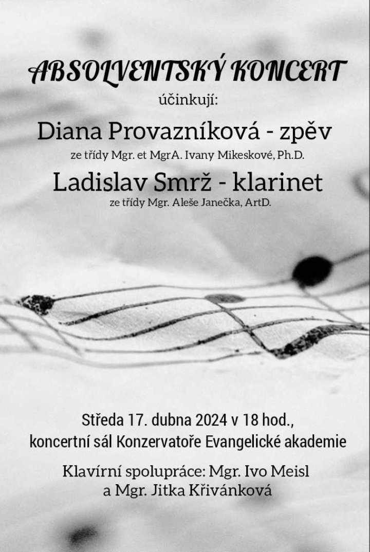 Absolventský koncert: Ladislav Smrž – klarinet, Diana Provazníková – zpěv 17 | 4 | 2024 18:00 hod.Koncertní sál Konzervatoře EA, Wurmova 13, Olomouc