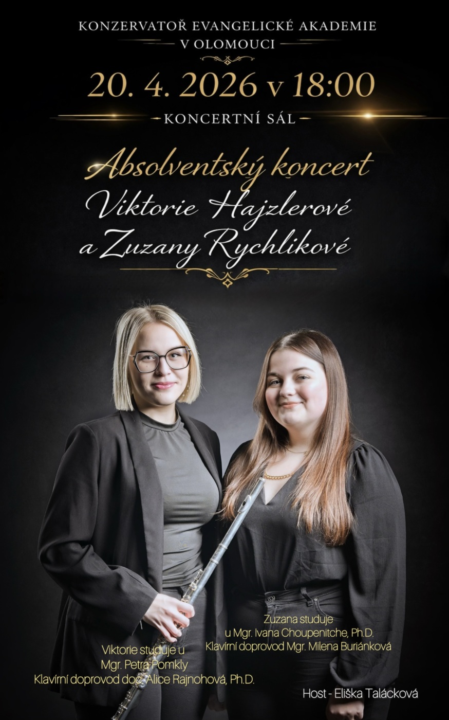 Absolventský koncert Viktorie Hajzlerové (příčná flétna) a Zuzany Rychlikové (zpěv) 20 | 4 | 2026 18:00 hod.Koncertní sál Konzervatoře EA, Wurmova 13, Olomouc
