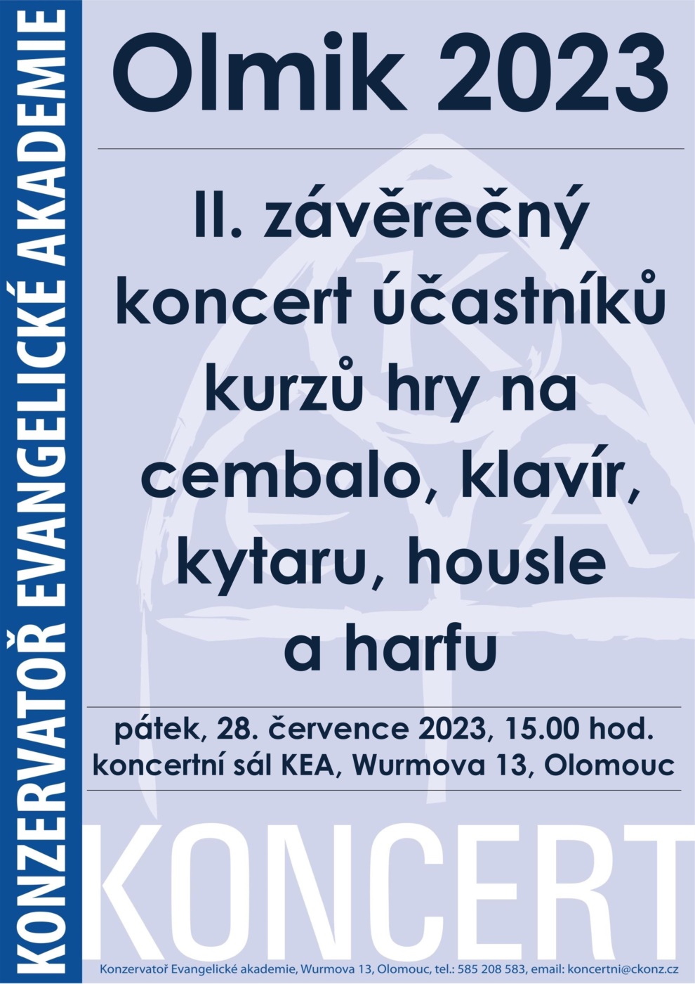 OLMIK 2023 – 2. ZÁVĚREČNÝ KONCERT ÚČASTNÍKŮ KURZŮ 28 | 7 | 2023 15:00 hod.Koncertní sál Konzervatoře EA, Wurmova 13, Olomouc