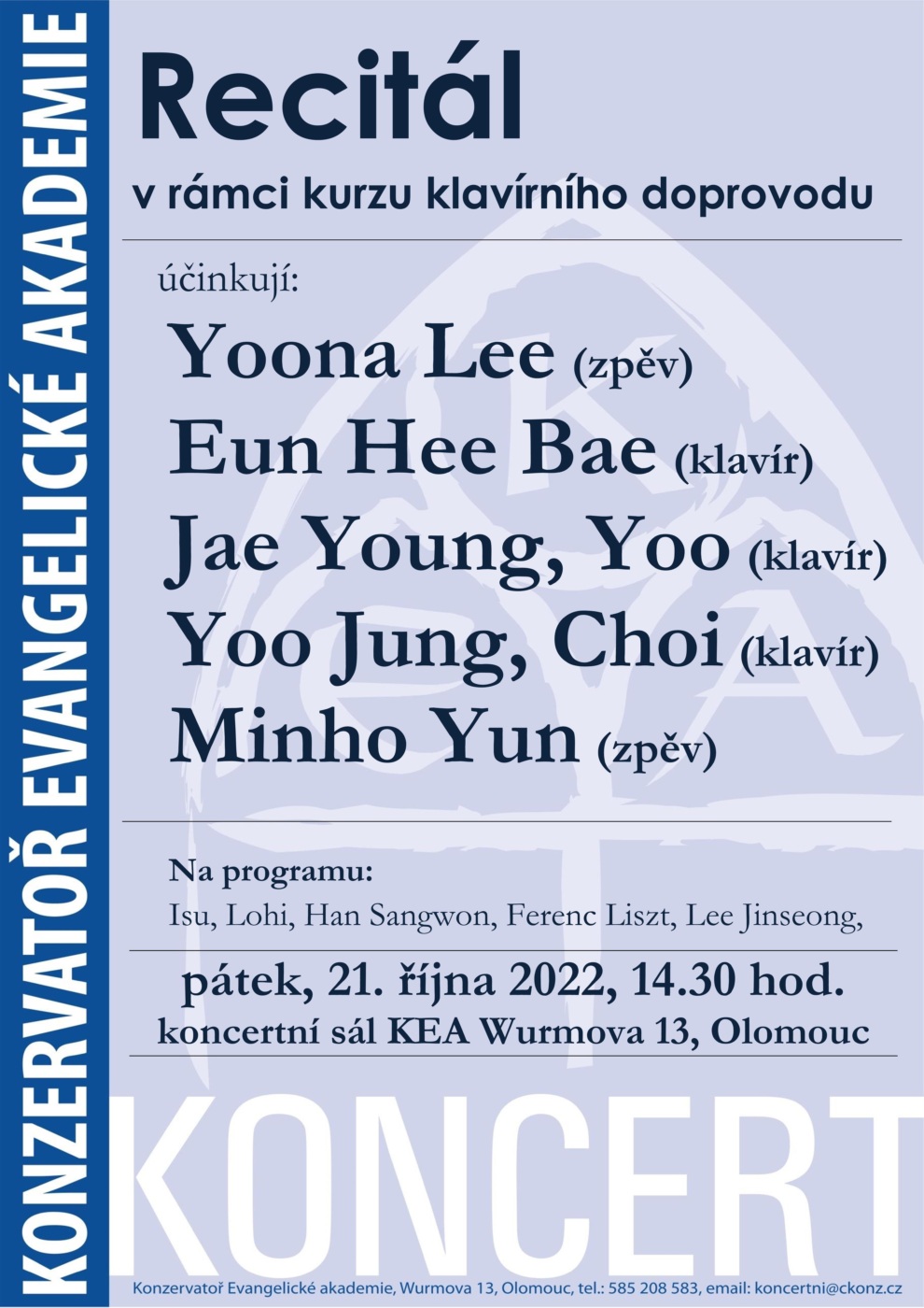 Recitál v rámci kurzu klavírního doprovodu 21 | 10 | 2022 14:30Koncertní sál Konzervatoře EA, Wurmova 13, Olomouc