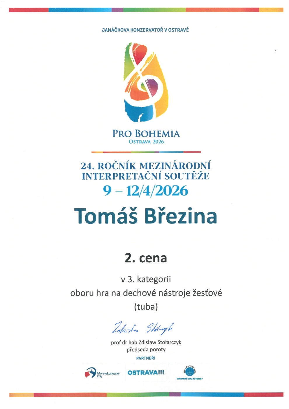 Na 24. ročníku Mezinárodní interpretační soutěže Pro Bohemia Ostrava 2026, která se uskutečnila ve dnech 9.–12. 4. 2026 v Ostravě,